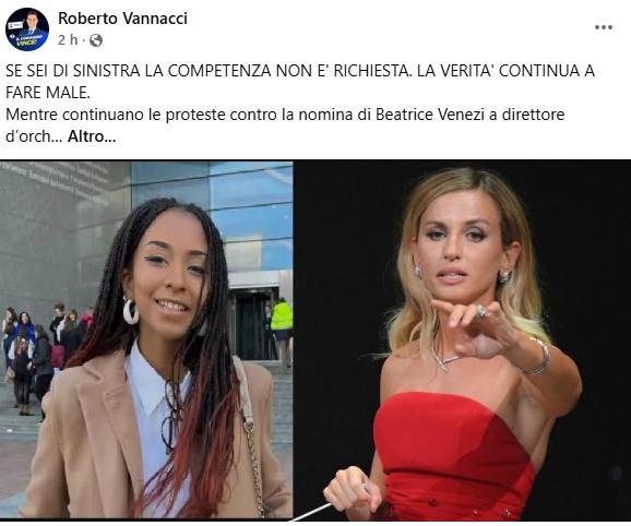 Lei, prosegue, “probabilmente avrebbe potuto anche essere nominata ‘direttrice’ d’orchestra alla Fenice, gli orchestrali avrebbero certamente festeggiato la nomina della prima donna dalla pelle nera e di origine africana. E se qualcuno avesse osato criticare, sarebbe stato tacciato di razzismo e fascismo.Beatrice Venezi non solo è di destra, ma è pure bianca, bionda e, magari, anche cristiana. Oltre ad essere indubbiamente competente”.