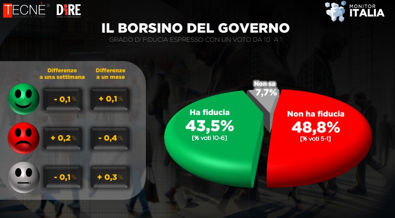 ROMA – In una settimana la percentuale di chi ha fiducia nel Governo è diminuita dello 0,1%, arrivando a quota 43,5%, ed è cresciuta dello 0,1% rispetto al mese scorso. Lo calcola il sondaggio realizzato da Tecnè per l’agenzia Dire con interviste effettuate tra il 17 e l’18 dicembre 2025.