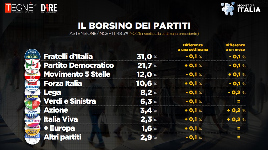 ROMA – Fratelli d’Italia confermano il primato tra i partiti italiani, in aumento i consensi di Pd e Forza Italia, cala il Movimento 5 stelle. È quanto emerge dal sondaggio realizzato da Tecnè per l’agenzia Dire con interviste effettuate tra il 14 e 15 gennaio.Fratelli d’Italia resta in testa col 31%, con un leggero calo dello 0,1%. Segue il Pd al 21,7% (+0,1), M5S al 12% (-0,1), Forza Italia al 10,6% (+0,1), Lega all’8,2% (-0,1). Avs al 6,3% (-0,1), Azione al 3,4% (+0,1), Italia Viva al 2,3% (+0,1) e infine +Europa all’1,6% (+0,1%).