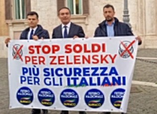 Dopo la battaglia dell’emiciclo, i tre si ritrovano fuori dalla Camera, in piazza. Srotolano uno striscione: “Stop soldi per Zelensky. Più sicurezza per gli italiani”. La loro iniziativa ha un’ispirazione chiara: “Bisogna far prevalere l’approccio diplomatico, non bellico- sottolinea Ziello- come sta facendo il presidente Trump”. Sensibilità a stelle e strisce, col retrogusto russo, a sentir Sasso: “La pace conseguita oggi offrirà delle condizioni migliori rispetto alla pace conseguita tra uno, due, tre, cinque o dieci anni”.