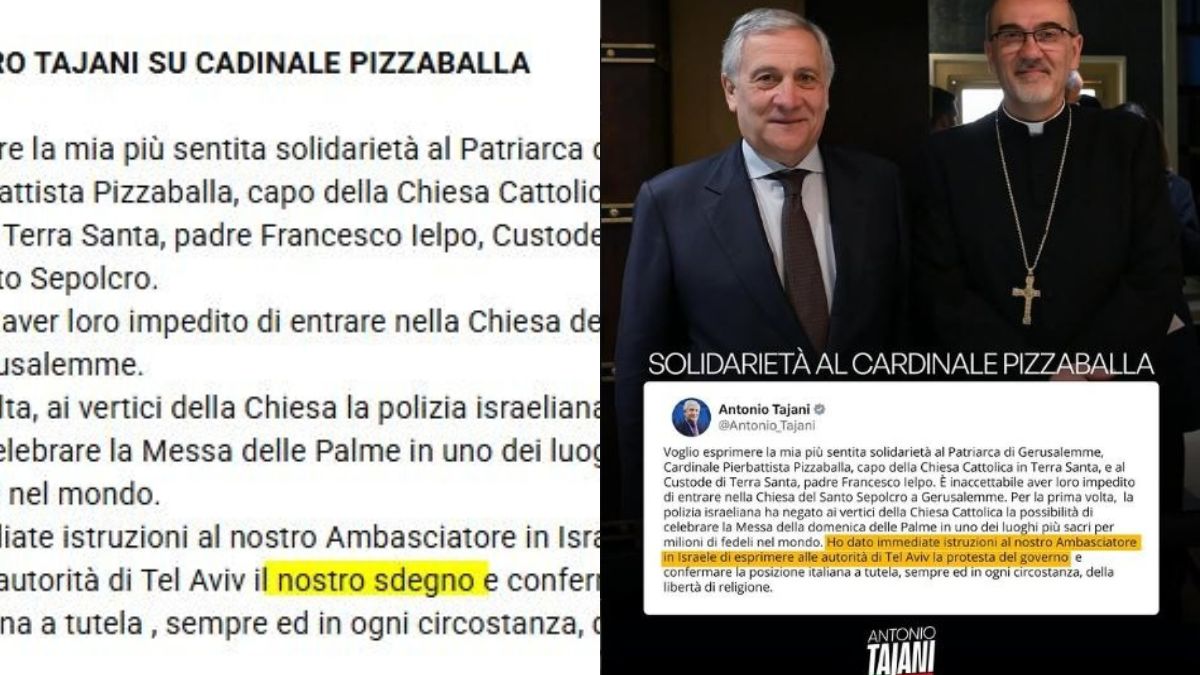 ROMA – “Sdegno” contro Israele. Anzi, no. Meglio “protesta”. Una parola fa la differenza? C’è un piccolo giallo intorno alla nota diffusa dalla Farnesina dopo il divieto della polizia israeliana al Cardinale Pizzaballa e a Monsignor Ielpo di entrare nella Chiesa del Santo Sepolcro a Gerusalemme la Domenica delle Palme. Il ministro Antonio Tajani, dopo la diffusione della notizia – che fa in poco tempo il giro di tutti i media internazionali – fa diramare alle agenzie di stampa e ai giornali una nota in cui, alla fine, annuncia di aver dato “immediate istruzioni al nostro Ambasciatore in Israele di esprimere alle autorità di Tel Aviv il nostro SDEGNO e confermare la posizione italiana, a tutela, sempre ed in ogni circostanza, della libertà di religione”.